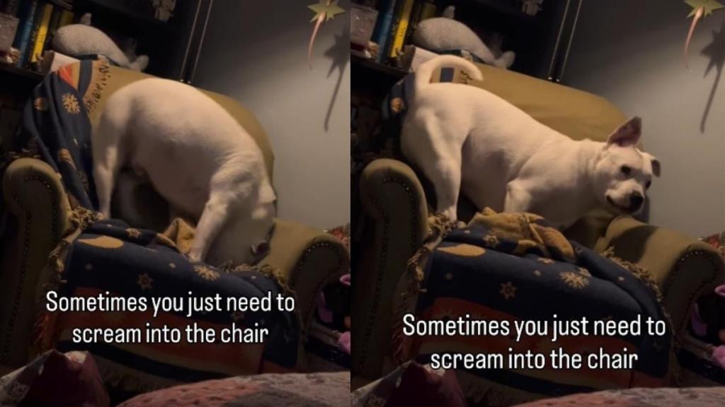 Penny posted the reel on @pennyfrxnces this week, from Newark. The dog chair video earned about 25,000 likes and 120 comments. Bilbo hops onto the chair and buries his head in the cushion. Onscreen text reads, “Sometimes you just need to scream into the chair.” He lets out a muffled squeal, then pops up again. He stares forward for a beat, then dives back in.