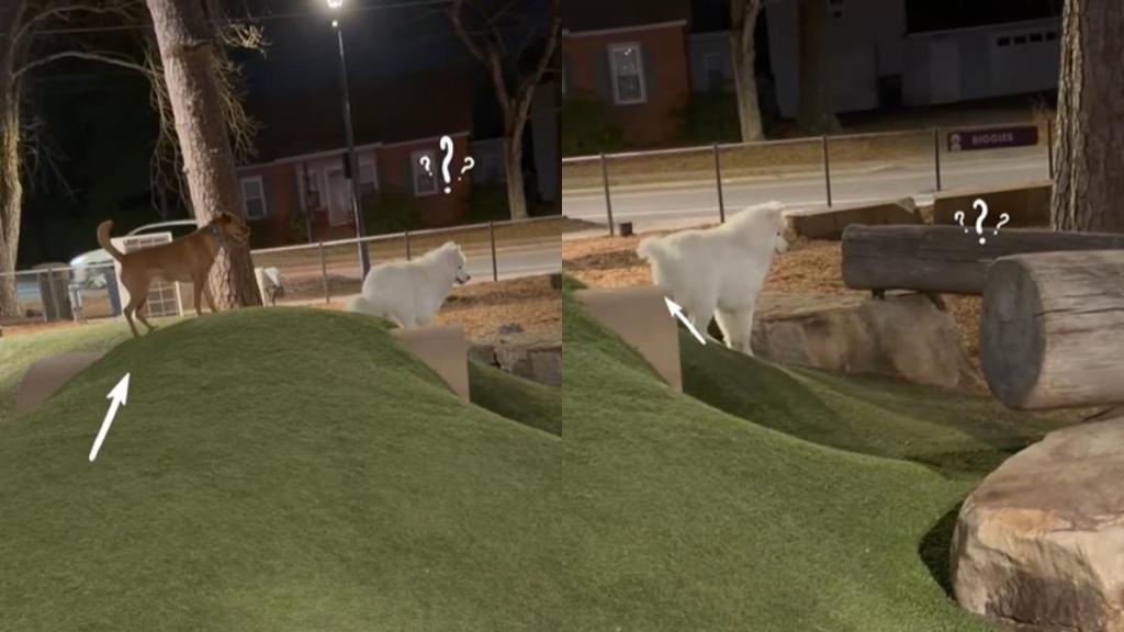 The other pup seems to be chasing Tofu as they run around with full energy. During the chase game, the two get separated in a funny way. While chasing the white fluff, the other furbaby goes into a tunnel, which confuses Tofu. The latter cannot see his pal going into the tunnel and coming out. However, they almost face each other before Tofu turns around.