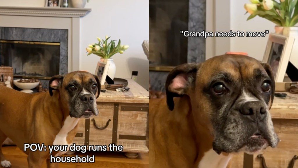 Princess Poppy does not believe in sharing prime seating with family guests. The boxer watches her grandpa settle onto the couch and reacts like a small household emergency has just begun. Her stare says everything. That is what makes the reel so funny. The dog does not bark through the whole thing. She glares, sneezes, stomps, and waits for justice. By the end, grandpa gives up, and the princess gets her spot back.